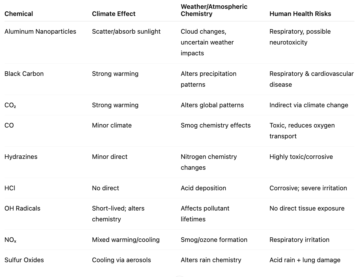 “Provide a detailed analysis of the effect that spraying very large amounts of the following chemicals would have on the climate, weather patterns and human health: Aluminum Nanoparticles. Black Carbon, Carbon Dioxide, Carbon Monoxide, Hydrazines, Hydrogen Chloride, Hydroxyl, Nitric Oxides, Sulfur Oxide”