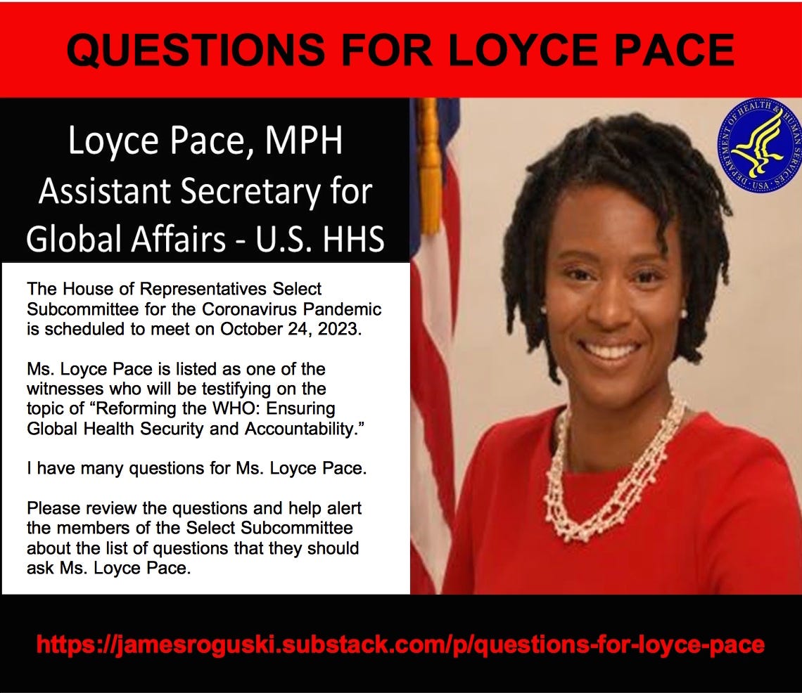 I ask all of my readers to help contact all of the members of the Select Subcommittee to encourage them to ask questions of Loyce Pace that are pertinent to her key role in the amendments to the International Health Regulations that were adopted on May 27, 2022 and can still be rejected, but action must be taken by the Biden Administration before December 1, 2023.