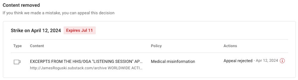 I had uploaded the same video excerpts from the official federal government sponsored HHS “listening session,” but YouTube determined that they were justified in censoring the video. WTF?