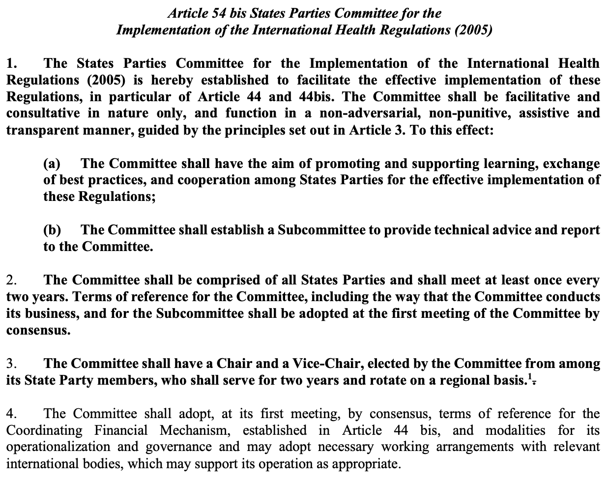 The creation of a States Parties Committee for the Implementation of the IHR (2005) to “facilitate the effective implementation” of the “Coordinating Financial Mechanism” along with the creation of a sub-committee to “provide technical advice” is yet another example of useless and wasteful bureaucracy that is UNACCEPTABLE.