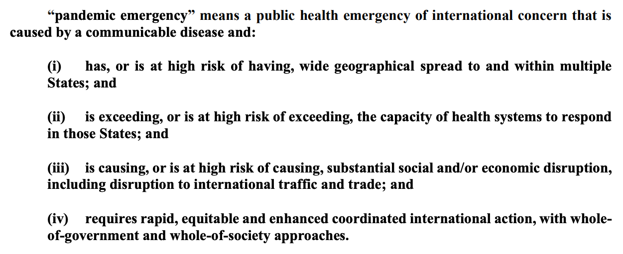 The definition of “pandemic emergency” is so vague that it is meaningless. It accomplishes nothing except to offer the Director-General a means to instill needless fear on a global basis which is UNACCEPTABLE.