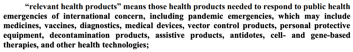 The definition of “relevant health products” should not contain cell-and gene- based therapies and it completely ignores natural herbs, nutritional products and alternative remedies. Mentioned in Articles 13, 16, 17 and 18 and Annex 1, it essentially guarantees profits for the Pharmaceutical Hospital Emergency Industrial Complex (PHEIC) at the expense of more affordable, safer and more effective natural products. This is UNACCEPTABLE.