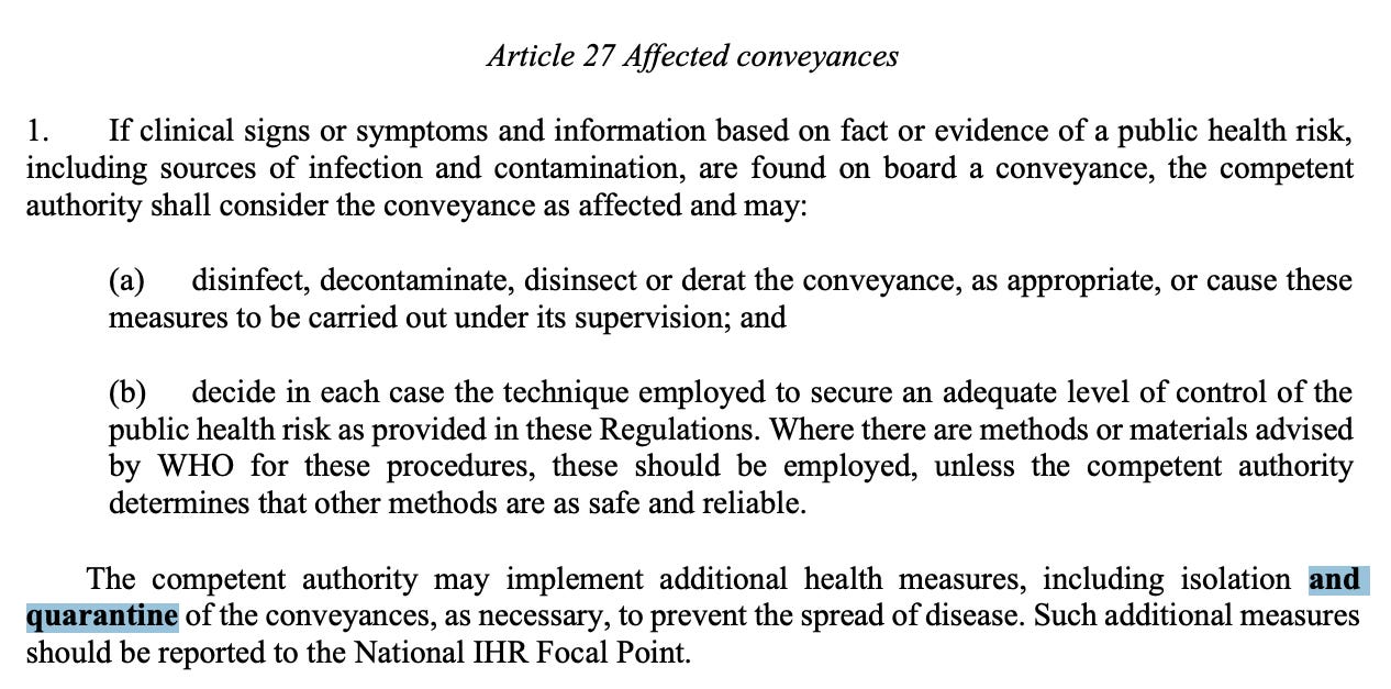 The additional authority to quarantine “suspect persons who are not ill” is an abominable violation of the fundamental right to liberty as well as a direct violation of Article 3 of the IHR(2005). This totalitarian overreach is also found in Articles 1, 18, 27, 31, 32, 40 and Annexes 1, 7 and 8. The unwarranted quarantine of people absolutely and totally UNACCEPTABLE.