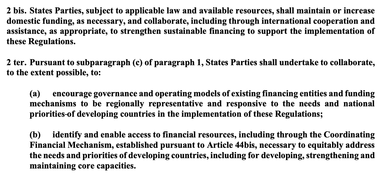 The Committee notes that, under Article 44, WHO already has a role, in collaboration with States Parties, to mobilize financial resources, and cautions against creating an explicit financing function for WHO under the Regulations.”