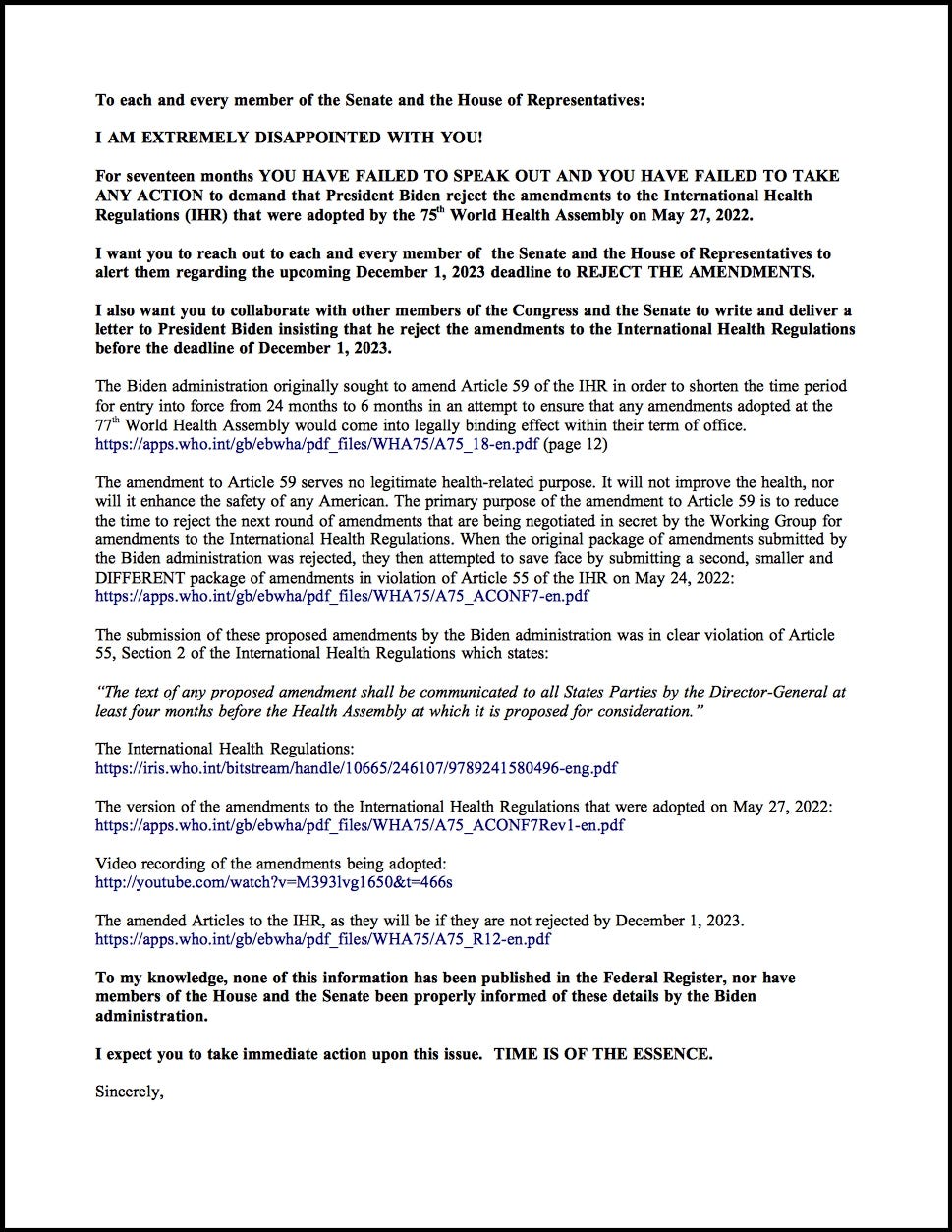 I also want you to collaborate with other members of the Congress and the Senate to write and deliver a letter to President Biden insisting that he reject the amendments to the International Health Regulations before the deadline of December 1, 2023.