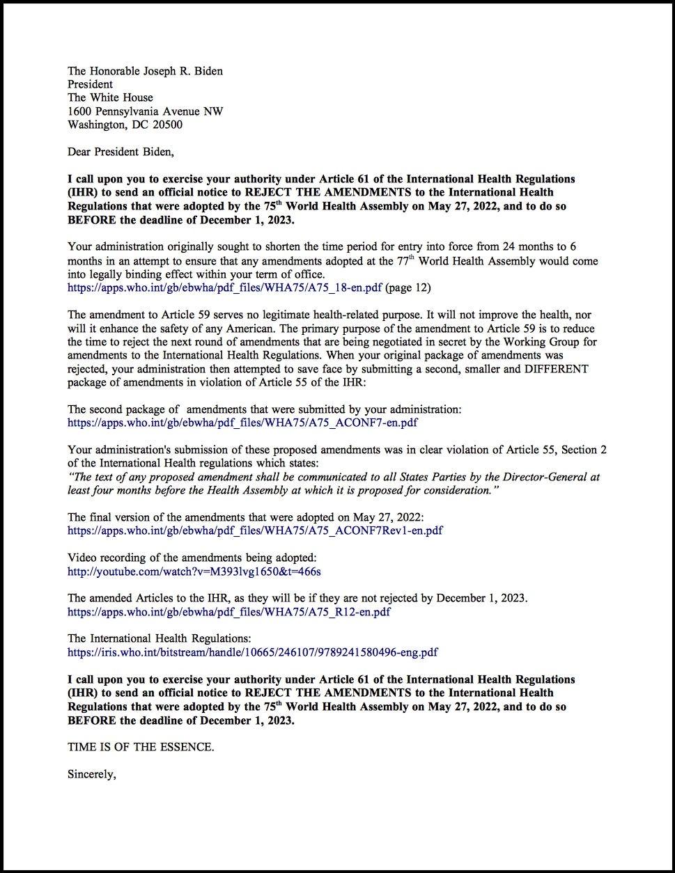 I call upon you to exercise your authority under Article 61 of the International Health Regulations (IHR) to send an official notice to REJECT THE AMENDMENTS to the International Health Regulations that were adopted by the 75th World Health Assembly on May 27, 2022, and to do so BEFORE the deadline of December 1, 2023.