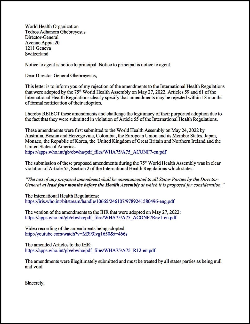 This letter is to inform you of my rejection of the amendments to the International Health Regulations that were adopted by the 75th World Health Assembly on May 27, 2022. Articles 59 and 61 of the International Health Regulations clearly specify that amendments may be rejected within 18 months of formal notification of their adoption.