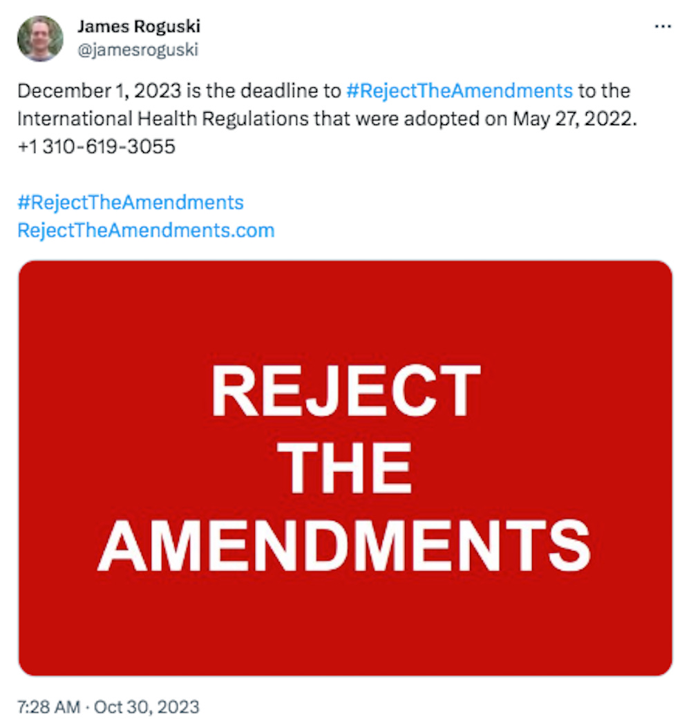 December 1, 2023 is the deadline to #RejectTheAmendments to the International Health Regulations that were adopted on May 27, 2022. NOW is the time to take action to #RejectTheAmendments.