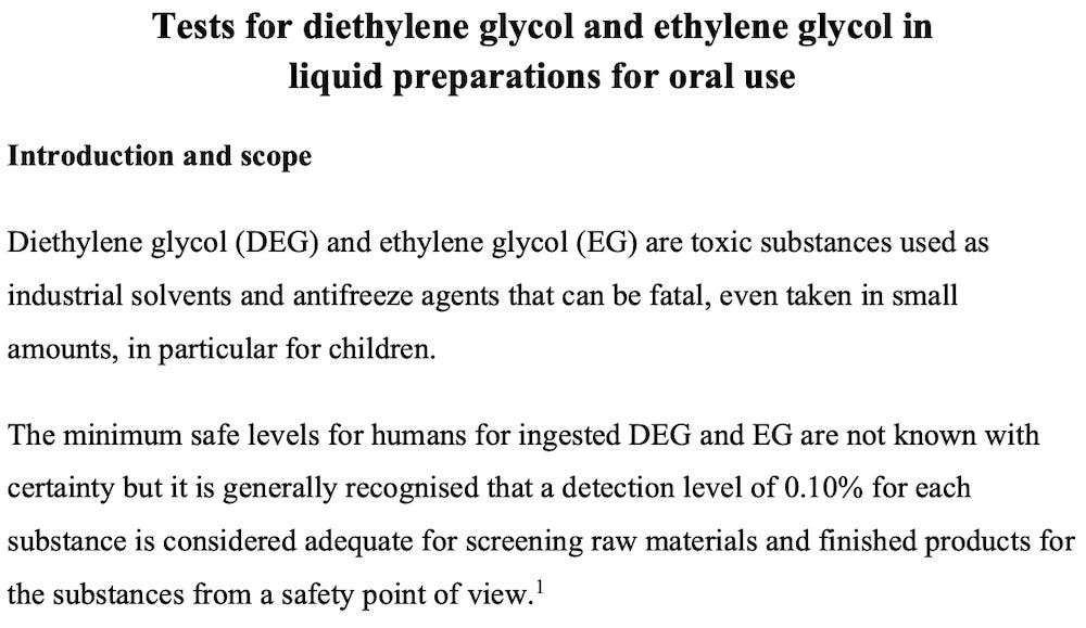 The routine screening detected potentially unacceptable amounts of diethylene glycol and ethylene glycol as contaminants. Laboratory testing conducted by the Therapeutic Goods Administration of Australia confirmed that all five batches were contaminated with ethylene glycol at levels ranging from 0.62 to 0.82% w/w relative to the accepted limit of not more than 0.10% w/w.