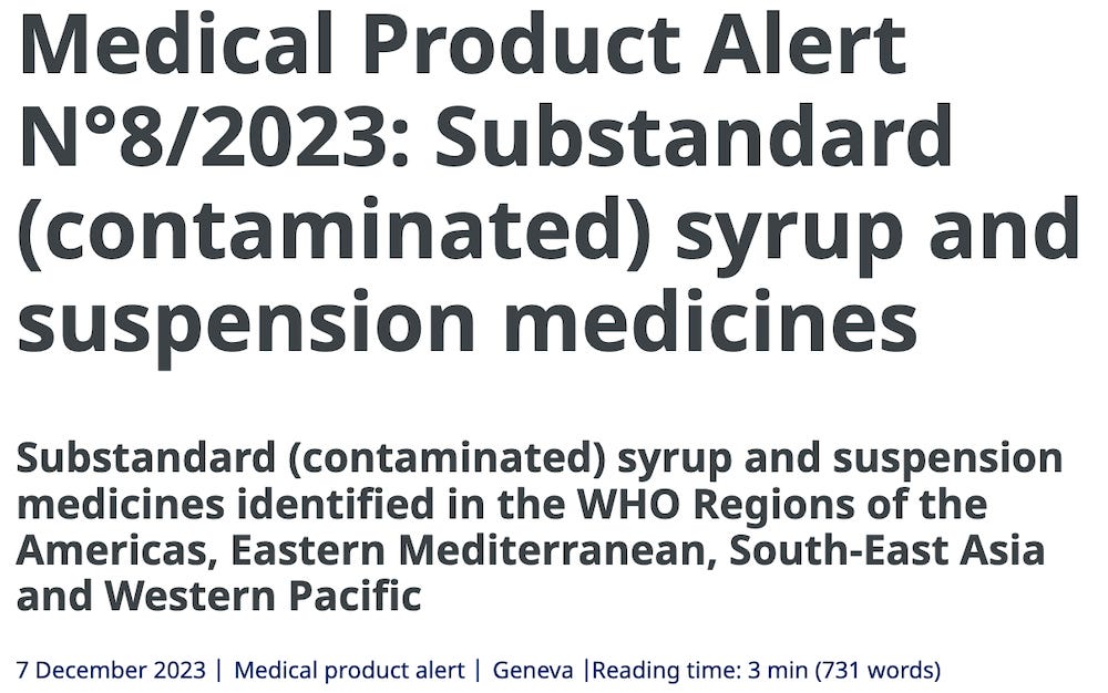 In November 2023, samples of five different batches of ALERGO syrup were screened for non-compliance by the quality control laboratory of the Maldives Food and Drug Authority (MFDA) in accordance with the thin layer chromatography (TLC) test for Diethylene Glycol and Ethylene Glycol for inclusion in The International Pharmacopoeia.