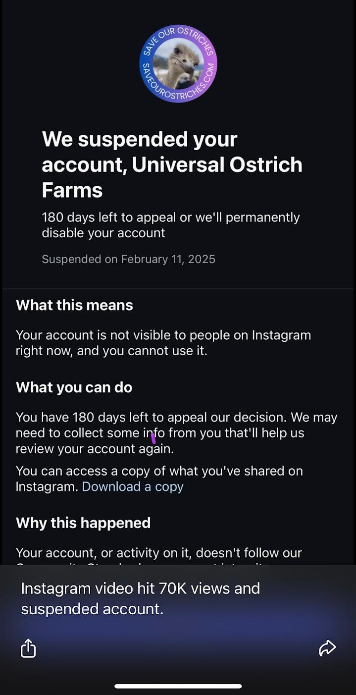 The "400 Healthy Ostriches Must be "Eradicated" says Canadian Food Inspection Agency" post on FaceBook recorded over 45K views in less than 24 hours, X recorded 21K, and Instagram 64K until Instagram "suspended" the account!