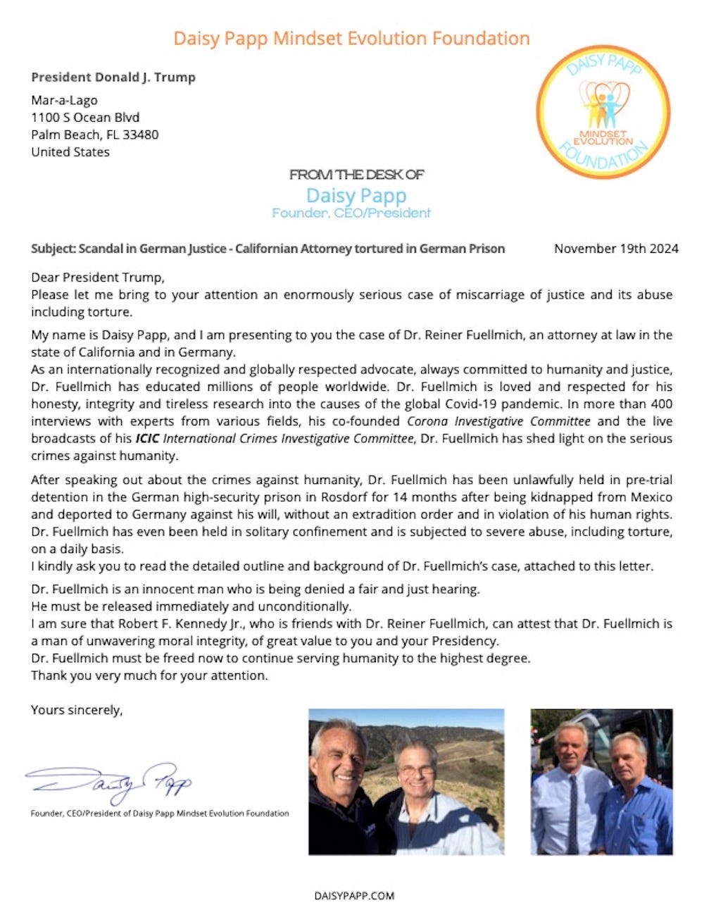 I am sure that Robert F. Kennedy Jr., who is friends with Dr. Reiner Fuellmich, can attest that Dr. Fuellmich is a man of unwavering moral integrity, of great value to you and your Presidency.