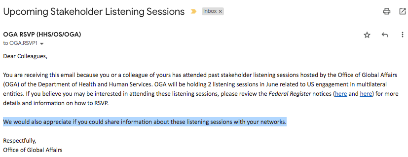 You are receiving this email because you or a colleague of yours has attended past stakeholder listening sessions hosted by the Office of Global Affairs (OGA) of the Department of Health and Human Services. OGA will be holding 2 listening sessions in June related to US engagement in multilateral entities. If you believe you may be interested in attending these listening sessions, please review the Federal Register notices (here and here) for more details and information on how to RSVP.