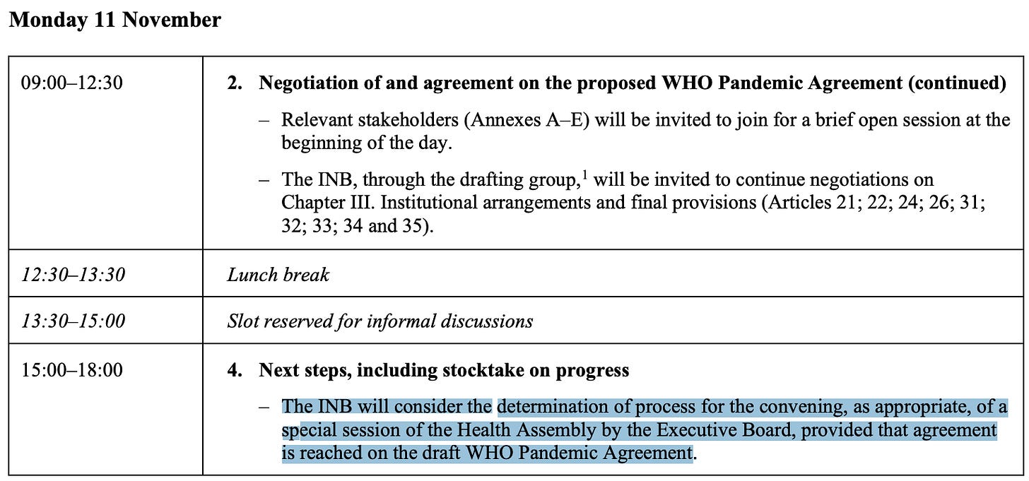 If agreement is reached on the proposed “Pandemic Agreement” by November 11, 2024, the Intergovernmental Negotiating Body plans to schedule a special session of the World Health Assembly to officially vote to adopt the agreement.