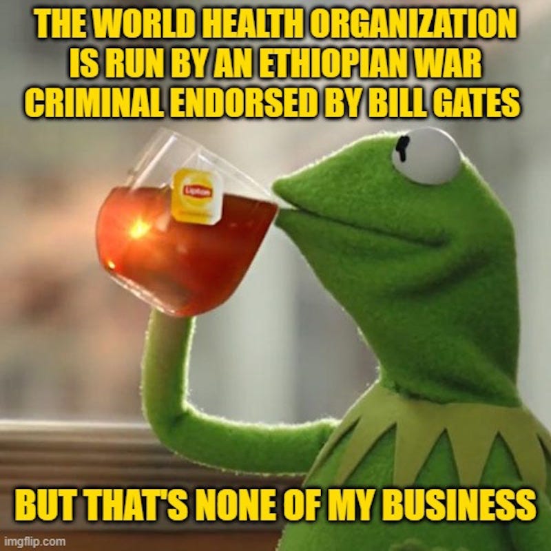So what we're doing is opening the door for communist type controls, and it's NO! Tedros and his gang subsumed under Gates, Bill Gates needs to stop. And India did a pretty good job of kicking Gates out when he spread polio in India. but this whole plan…