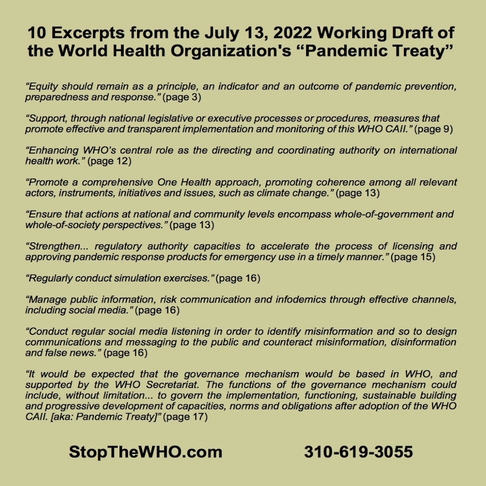 Yeah, I'm calling an opposition to the World Health Organization’s pandemic treaty. They need to stay out of individual countries. Every country, every state, every citizen should be able to decide how they want to treat their own health and not be governed by some distant totalitarian type of organization like the WHO.
