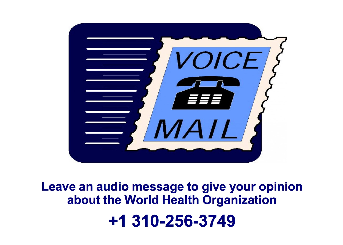 To submit your spoken audio comment/opinion about the World Health Organization, please call +1 310-256-3749 and leave your message via voicemail.