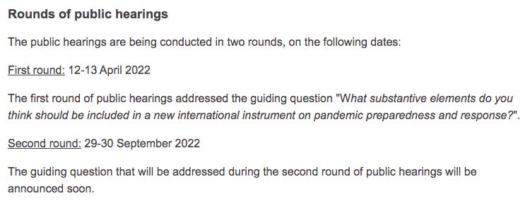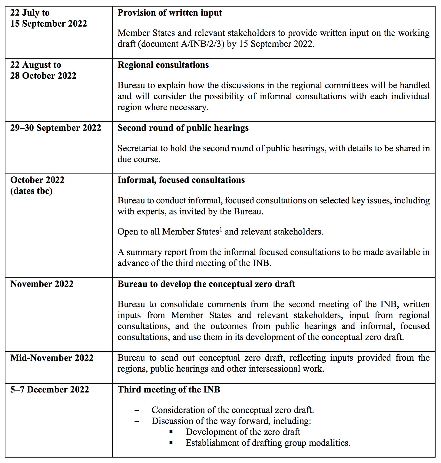 According to Mr. Steven Solomon of the INB, during a live streaming of a meeting titled “120 - Seminários CRIS 2022 - Challenges of global health regulation”, on 10 August 2022, member states have to submit their written input on the working draft of the ‘treaty’ by no later than September 15, 2022.