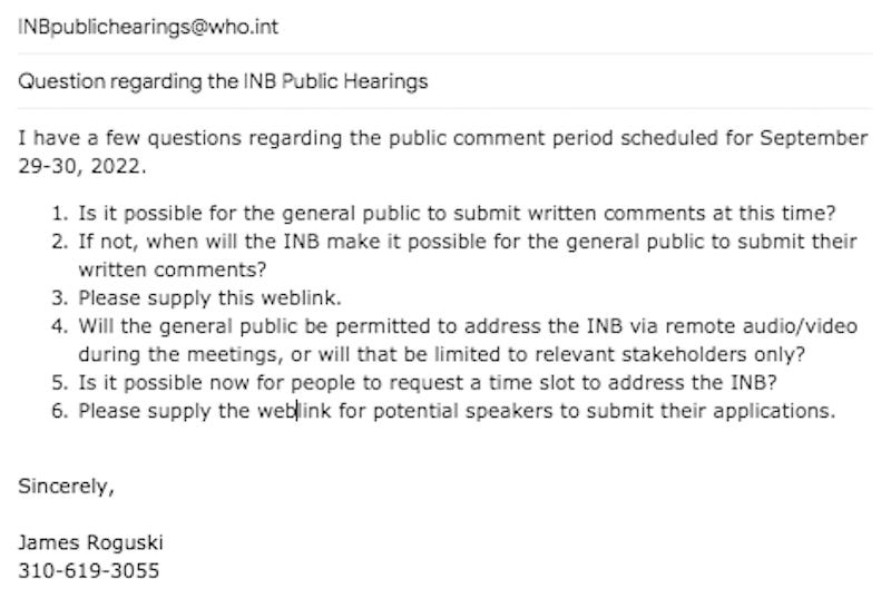 NOTE: On August 25, 2022, I (James Roguski) sent the above email to 15 members of the United States delegation to the WHO as well as over 200 additional employees of the Office of Global Affairs. NO ONE HAS RESPONDED.