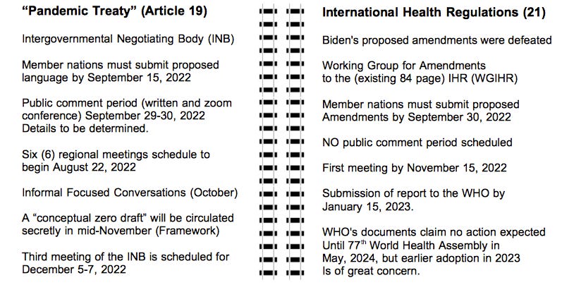 The WHO is attempting to negotiate a legally binding international ”Pandemic Treaty" which could usurp national sovereignty and restrict our personal freedoms. The delegates from every nation have been instructed by the WHO to submit their written proposals to the Intergovernmental Negotiating Body by September 15, 2022.