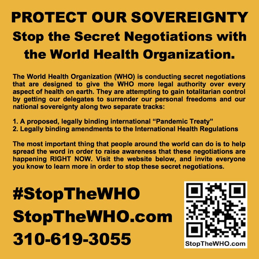 The delegates from all 194 member nations are busy working on plans to give more power and control to the World Health Organization at the expense of your national and personal sovereignty, bodily autonomy, personal privacy, inalienable rights and fundamental freedoms.