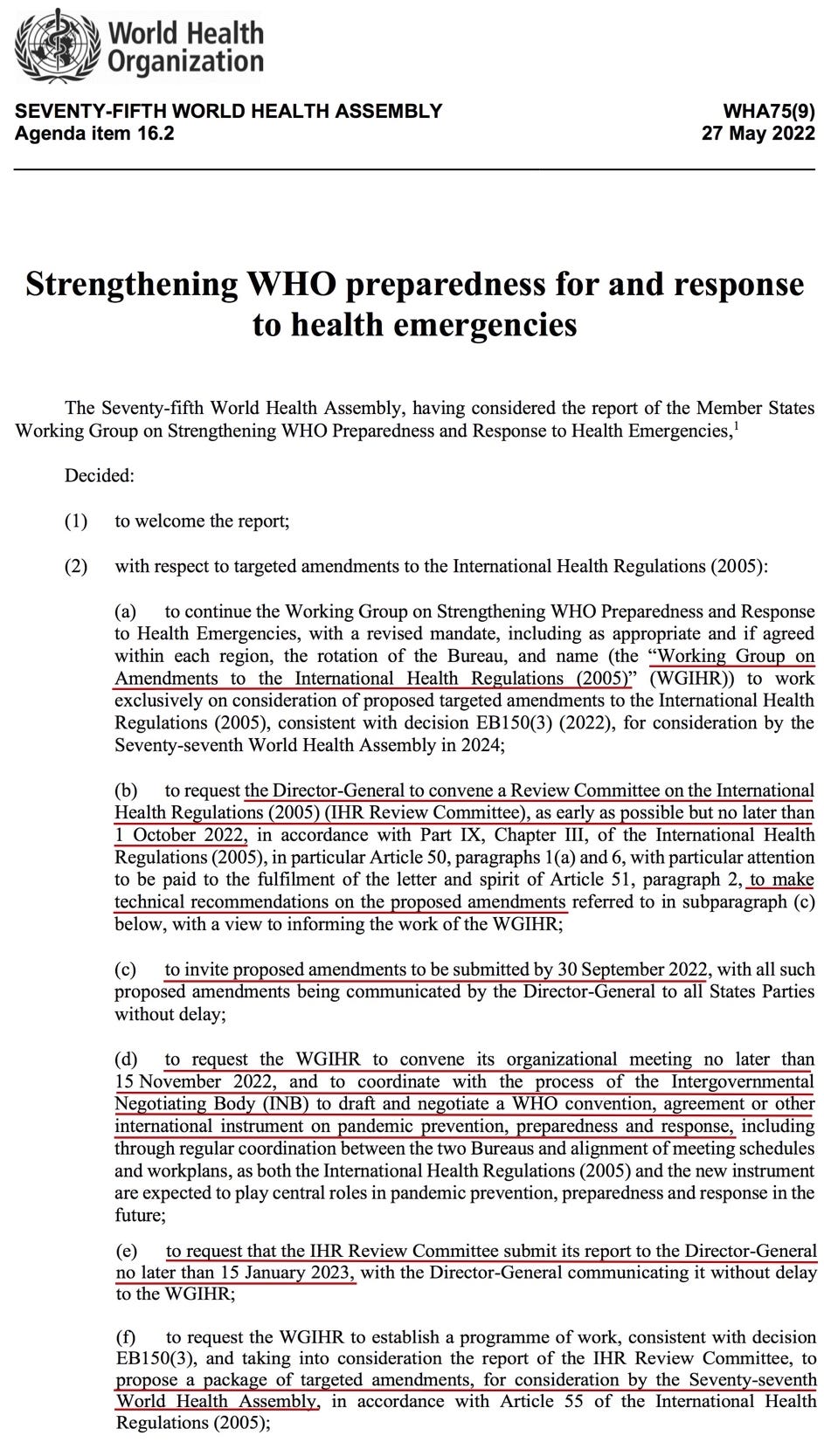 At the same time, the WHO has set up a Working Group for amendments to the International Health Regulations (WGIHR). The International Health Regulations are an existing body of international law that are legally binding upon all member nations, and any amendments to the IHR would also be legally binding. Delegates from every member nation have been instructed by the WHO to submit their written proposals by September 30, 2022.
