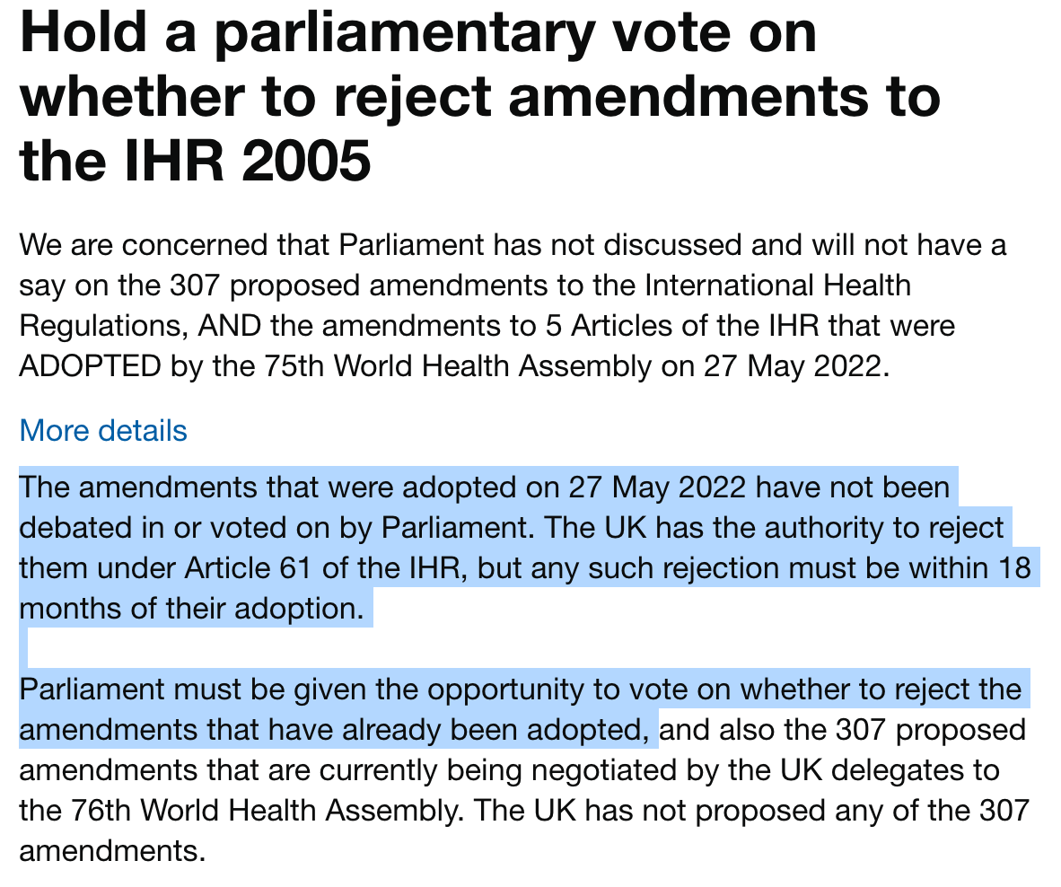The deadline for the heads of state throughout the world to reject the amendments to the International Health Regulations is 1 December 2023. A UK petition with 116,390 signatures has been ignored.