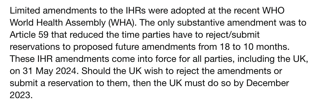 This will be problematic in the very near future, as there are around 300 Amendments to the International Health Regulations which are currently being negotiated and finalised, to be voted on in May 2024 at the 77th World Health Assembly, by the largely unknown, unelected and unaccountable delegates from each country. Adoption of these amendments will require NO UK Parliamentary scrutiny or vote.