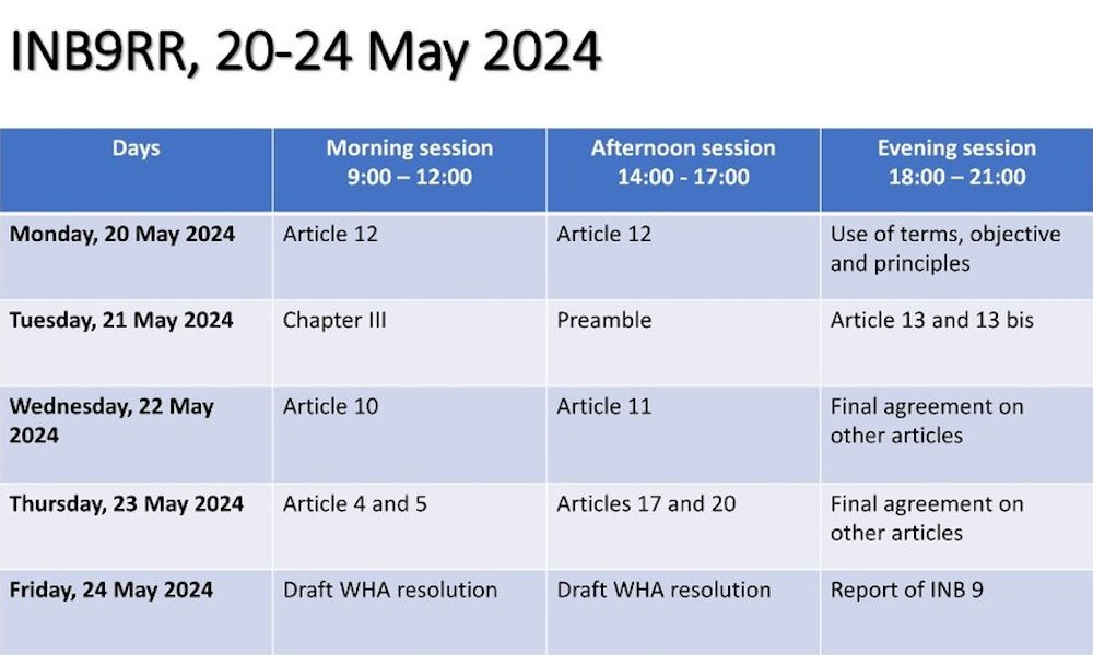 A revised version of the proposed amendments was supposed to be circulated on May 10, and the 8th session of the Working Group for amendments to the International Health Regulations was scheduled to be held on May 16-17, 2024.