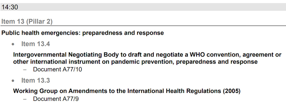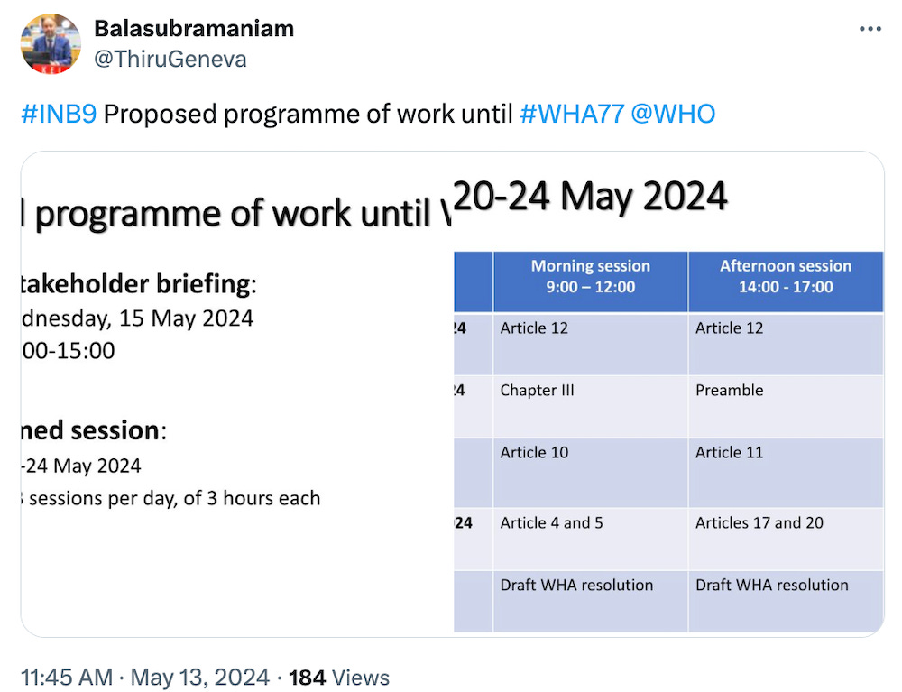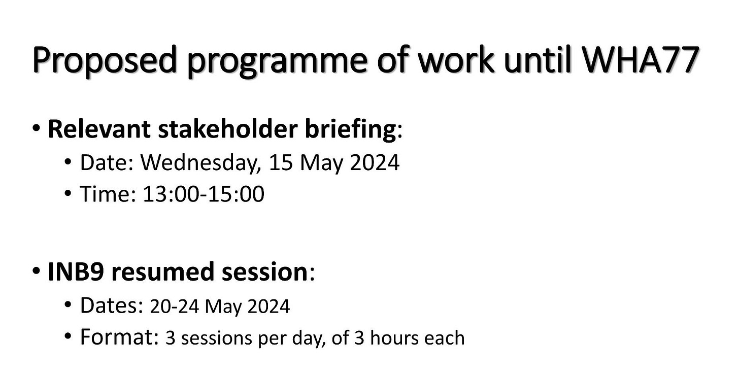 The resumed session of the WGIHR scheduled for May 16-17, 2024 (which was added to the WHO website) has been removed.