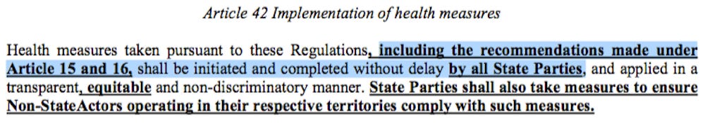 Temporary recommendations made by the WHO under Article 15 and standing recommendations made by the WHO under Article 16 of the International Health Regulations SHALL BE INITIATED AND COMPLETED WITHOUT DELAY BY ALL STATE PARTIES.