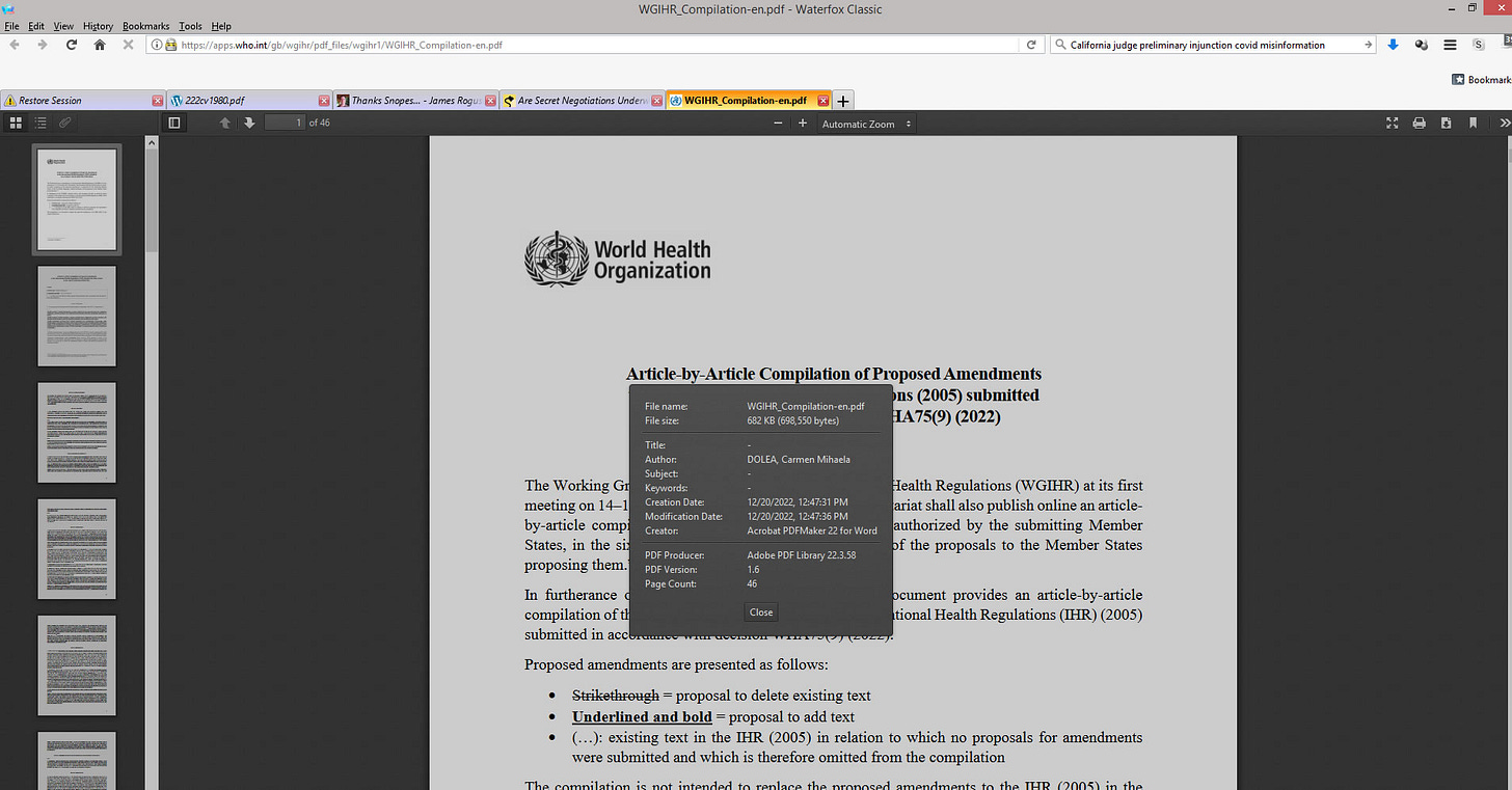 that Snopes claimed to have accessed the 46 page compilation of the proposed amendments to the International Health Organization on November 18, 2022, because I checked the WHO website daily throughout October, November and December and the first time that I was able to find it on the WHO’s website was December 14, 2022, which was nearly a month later than Snopes claims to have been able to access it.