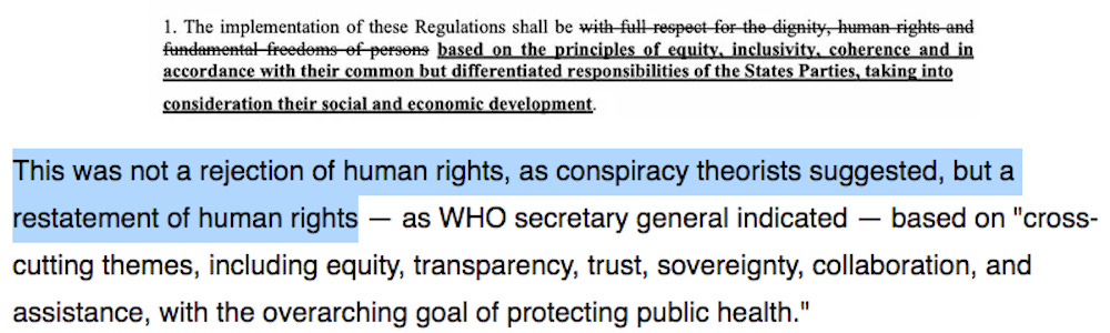 how Snopes tried to redefine the crossing out of “full respect for the dignity, human rights and fundamental freedoms” as being merely a “restatement of human rights,” not a rejection of them. Very interesting spin!