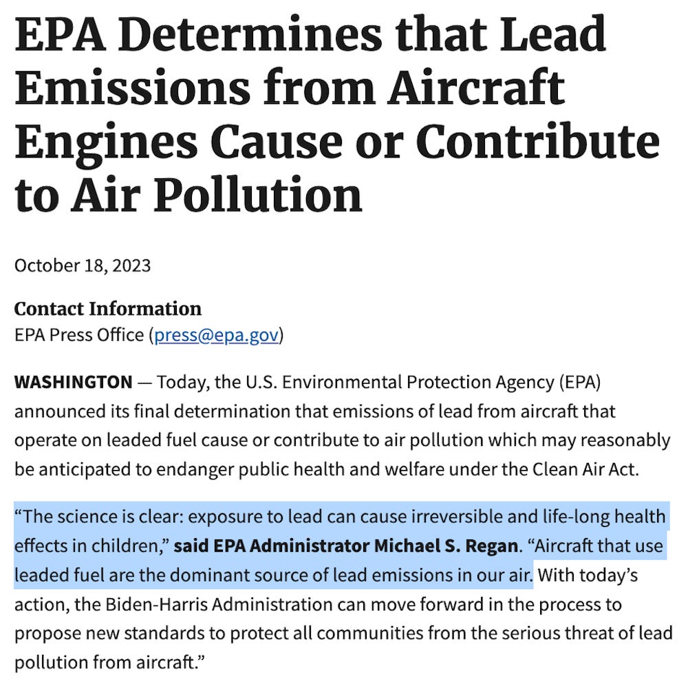 In 2022, the U.S. Environmental Protection Agency proposed a finding that lead emissions from aircraft engines cause or contribute to air pollution endangering public health, targeting aviation gasoline (avgas).