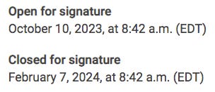 A. The petition will be open for 120 days. The last day to sign is February 7, 2024 at 8:42 am EDT.
