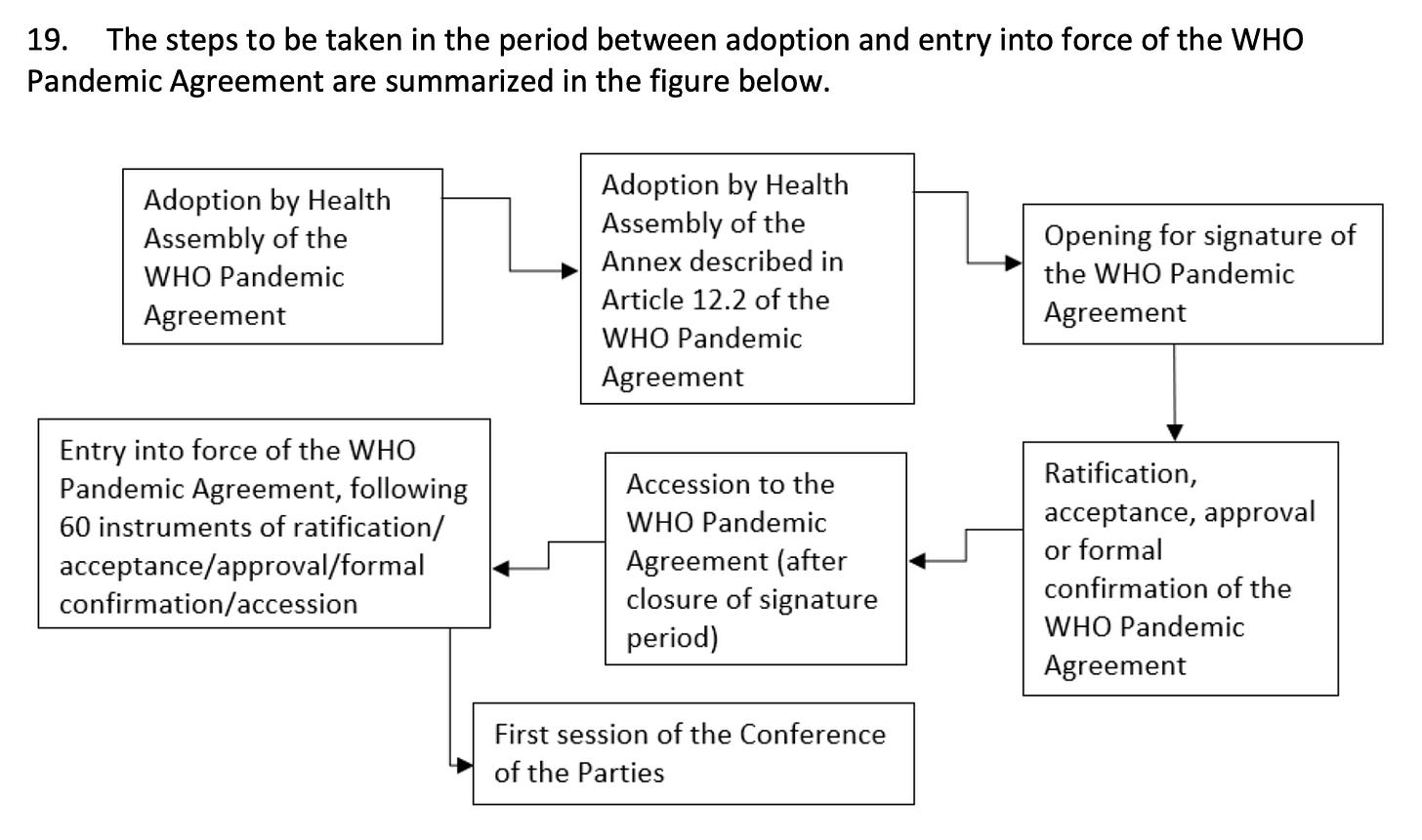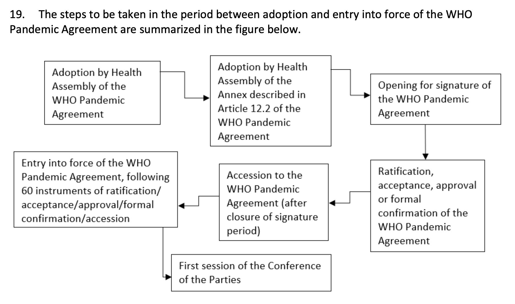 10. As the WHO Pandemic Agreement will not open for signature until certain conditions are satisfied (as further discussed in paragraph 11 below), there may be different views among Member States regarding the date on which the above-mentioned “action” is required, and what such action may be. The view could be taken that Article 20 is not a constraint, it merely states an undertaking that some sort of “action” will be taken within a time frame; it is up to each Member state to determine what that “action” could be. The sole precedent for the application of Article 20 of the WHO Constitution is the WHO Framework Convention on Tobacco Control, for which it is not recalled that any Member State raised the issue of Article 20.