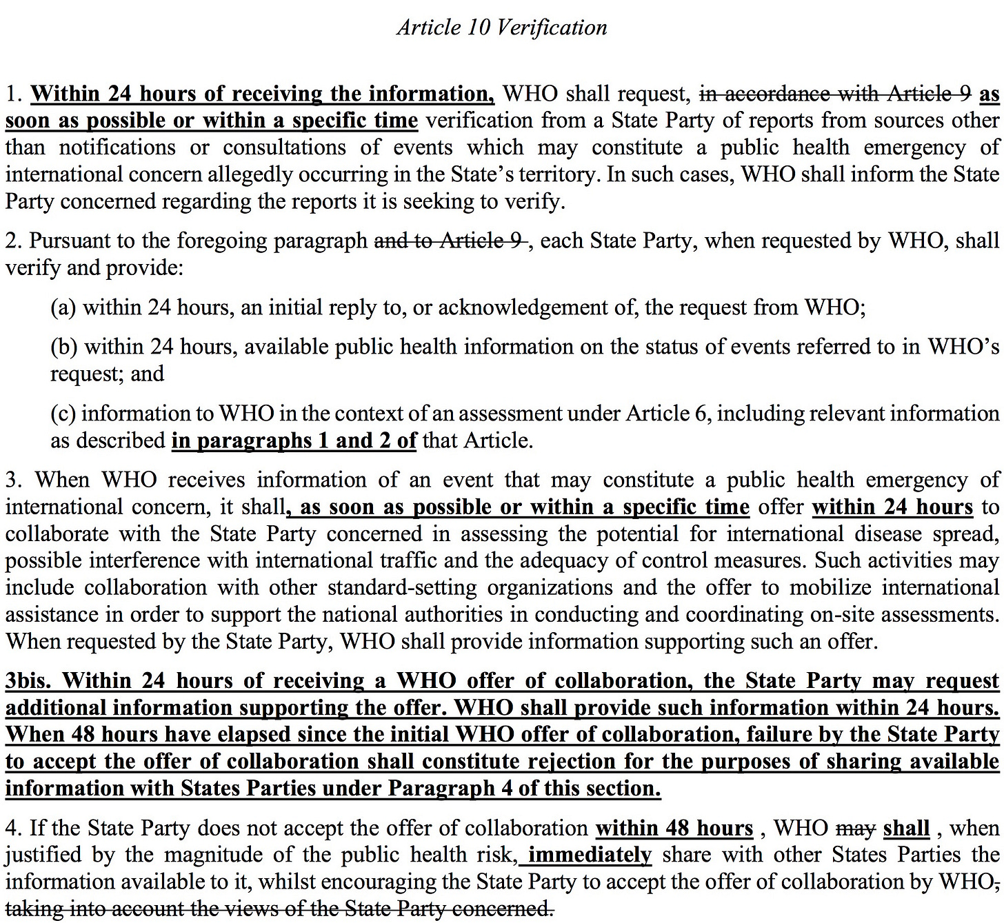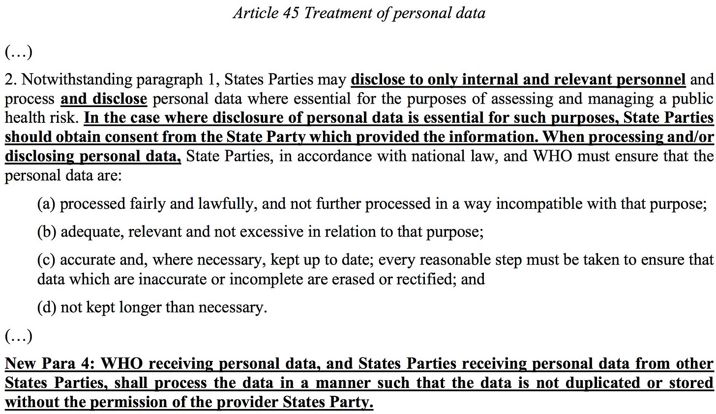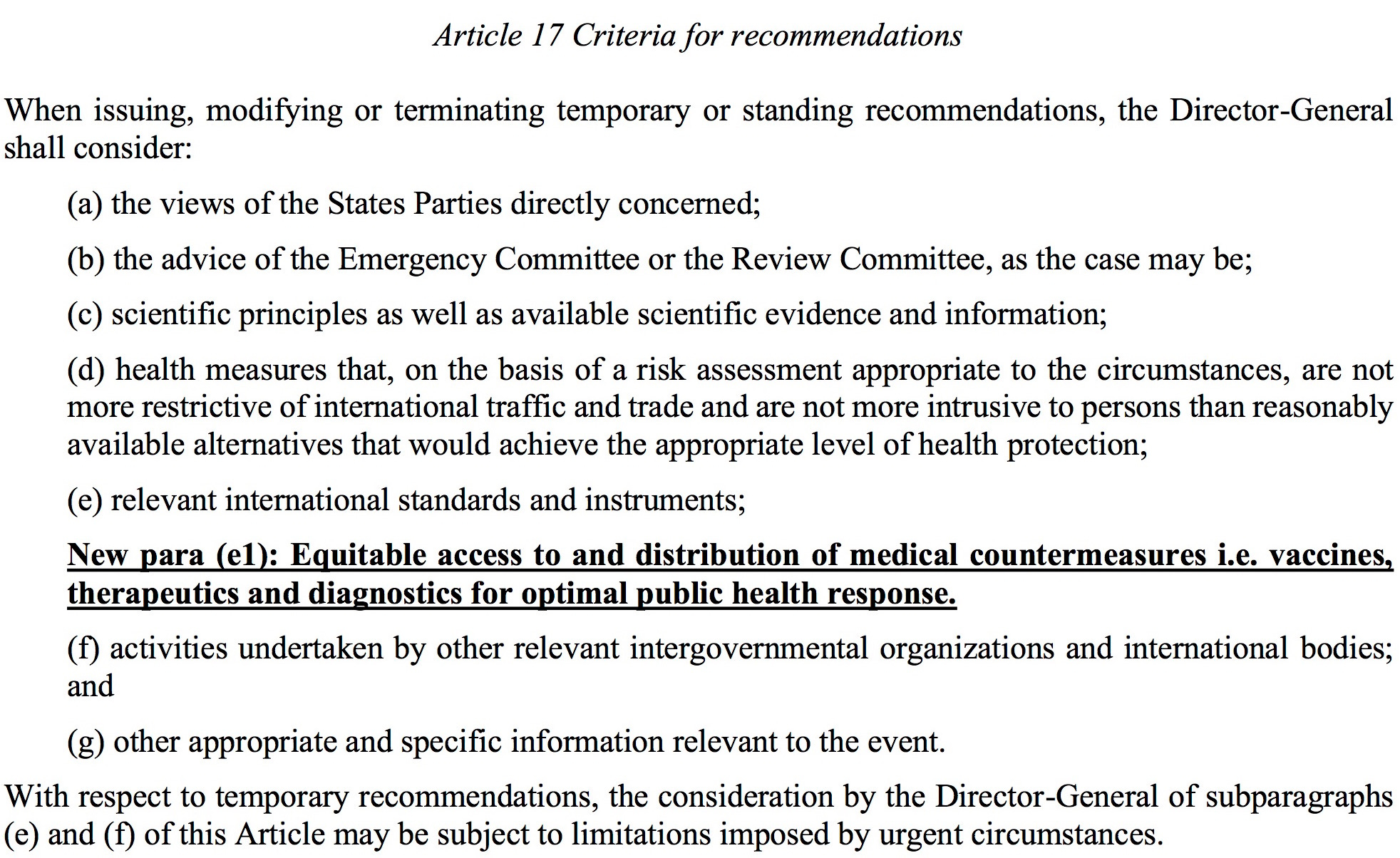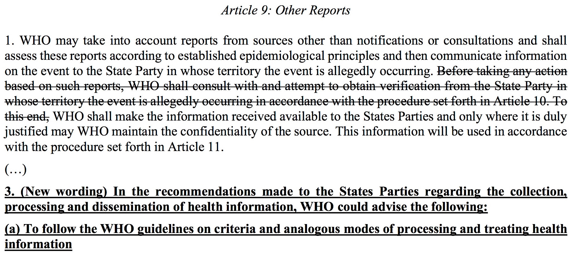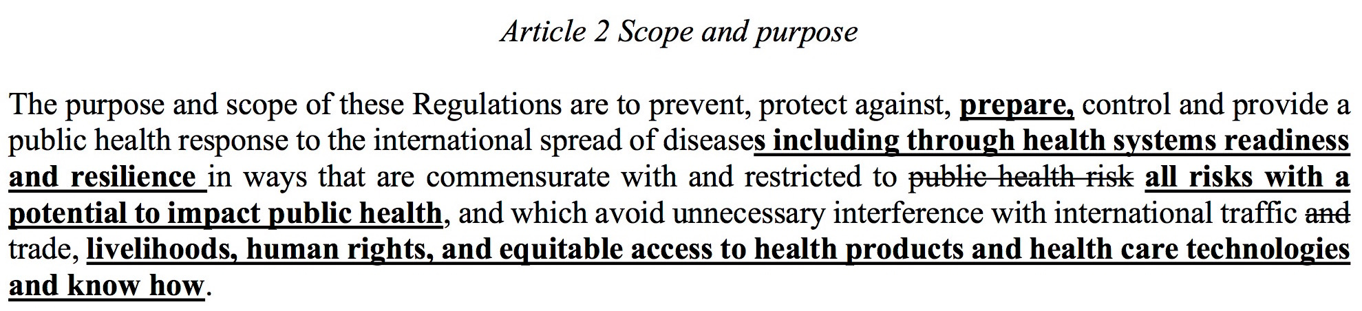 The proposed changes to the first principle in Article 3 of the International Health Regulations pretty much says it all. If adopted, they would strike out the following text: