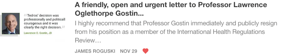 Contact Mr. Gostin to share your opinion regarding the proposed amendments to the International Health Regulations. Ask him why there are no plans to accept public comment in the process of amending the IHR.