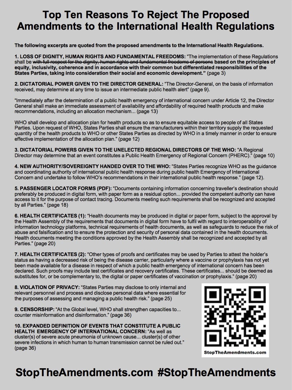 This email is to bring your attention to the secret negotiations being conducted by the World Health Organization regarding proposed amendments to the International Health Regulations as well as the proposed “Pandemic Treaty.”