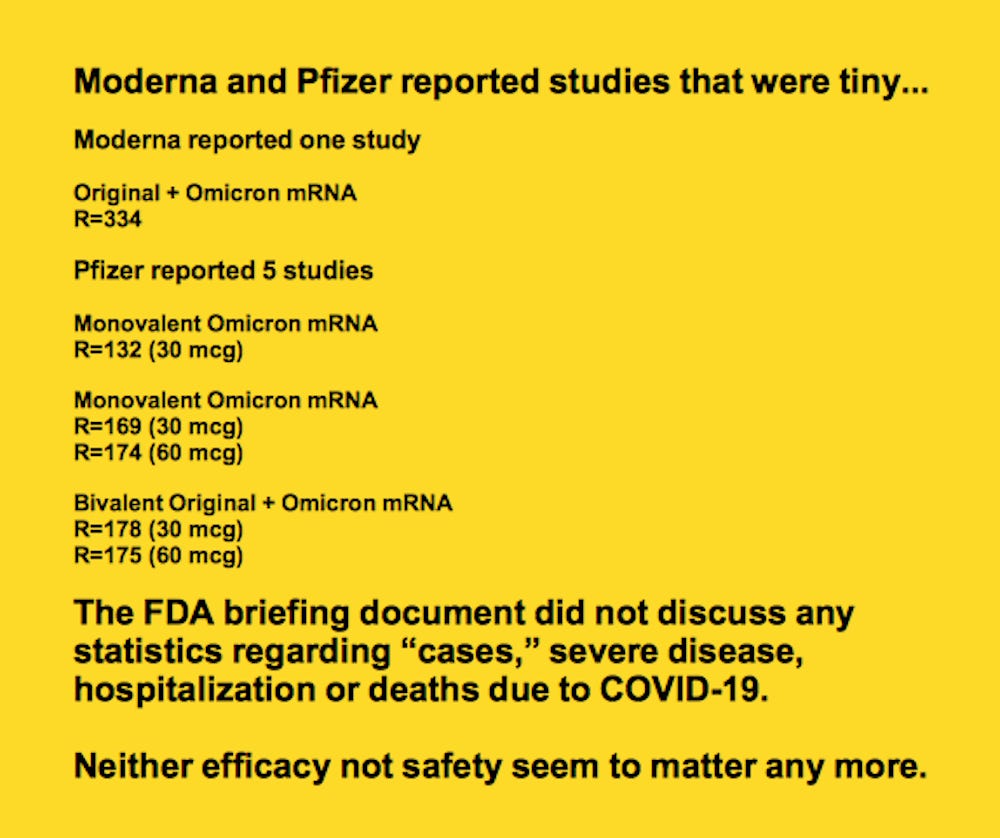 If you change a single molecule of mRNA in these shots it will change health outcomes in ways that no one can anticipate. That necessarily requires new clinical trials — which is what the FDA is proposing to skip.
