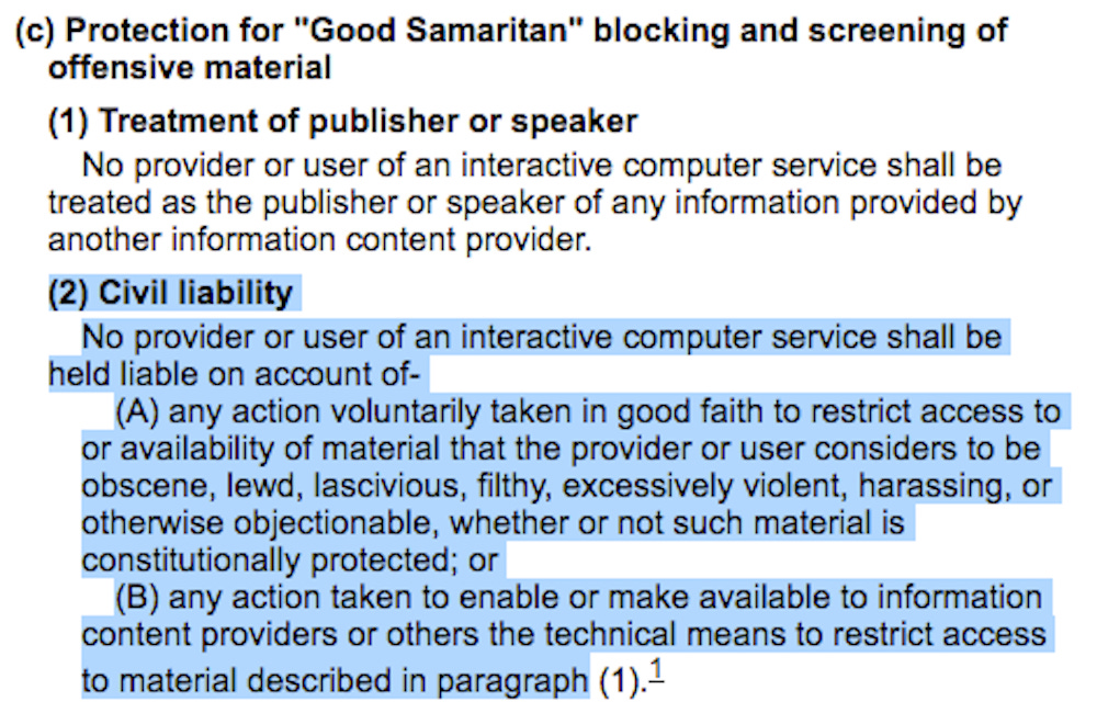 In overly simplistic terms, social media companies have been granted protection from liability if they choose to restrict speech (“material”) that they find to be “otherwise objectionable, whether or not such material is constitutionally protected.”