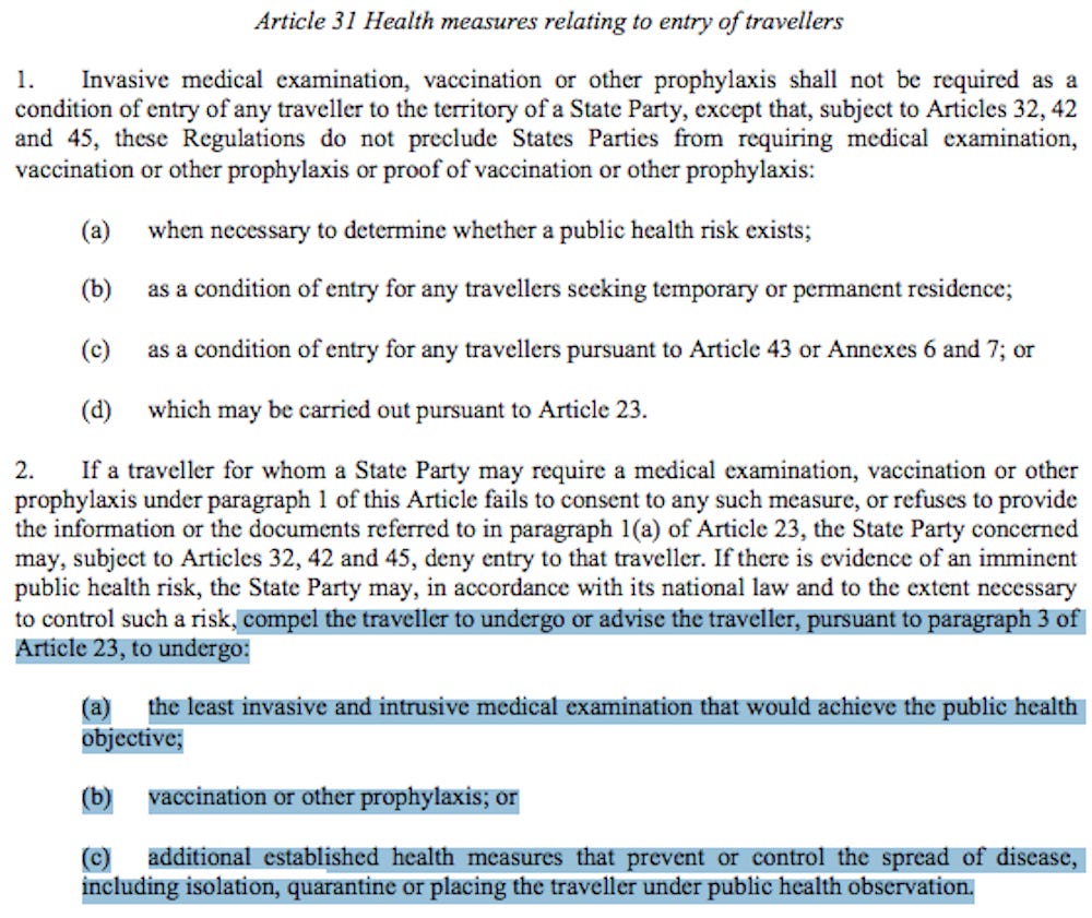 Article 31 below is from the existing International Health Regulations (2005):