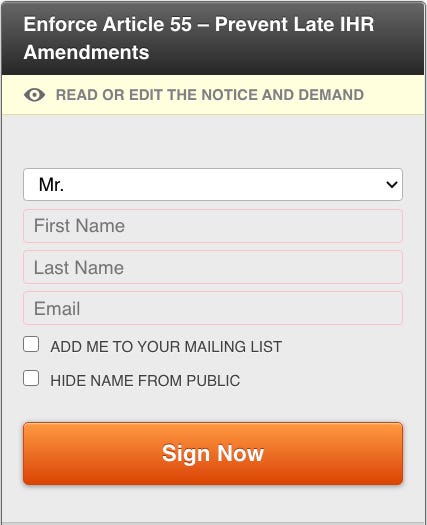 Since the WHO DG failed to communicate a package of amendments in alignment with Article 55, please halt all further approvals and alert the WHO DG that US will not approve any IHR amendment at the World Health Assembly, WHA 77. We demand to halt any further approvals of any late IHR amendments which would be in violation of article 55.