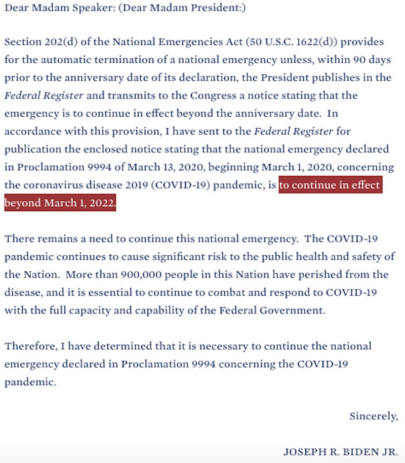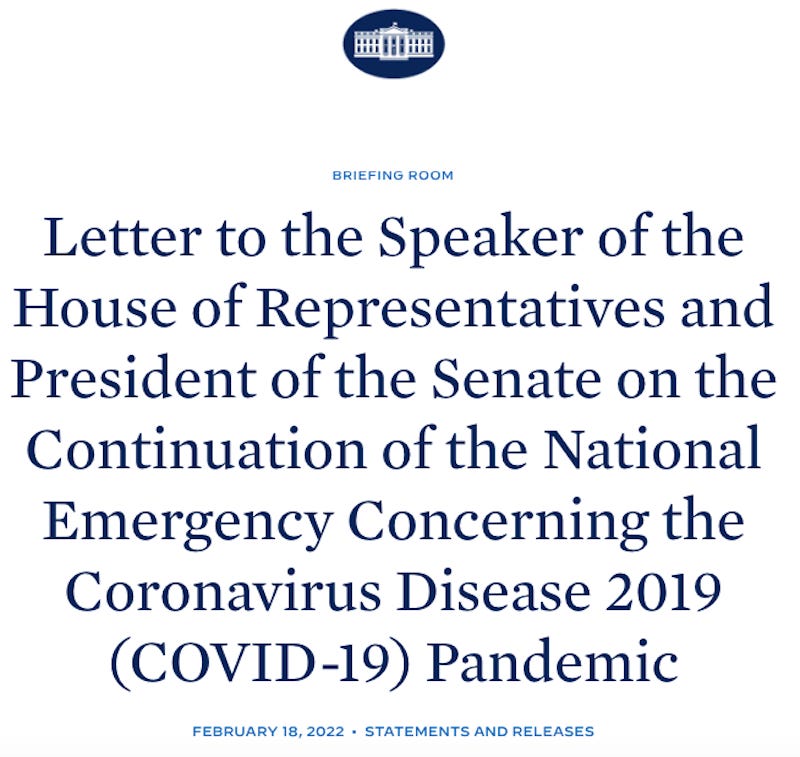 On February 18, 2022, President Joe Biden send an official letter to Speaker of the House Nancy Pelosi to inform her that he would soon be renewing the COVID-19 national emergency for another year.