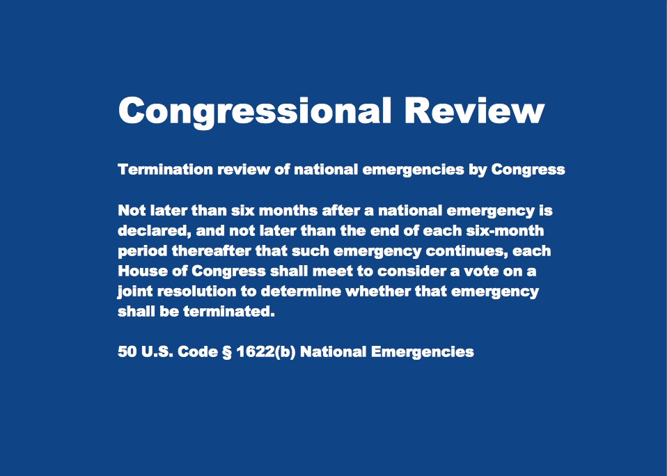 50 U.S. Code § 1622(b) clearly states that “not later than six months after a national emergency is declared, and not later than the end of each six-month period thereafter that such emergency continues, each House of Congress shall meet to consider a vote on a joint resolution to determine whether that emergency shall be terminated.”