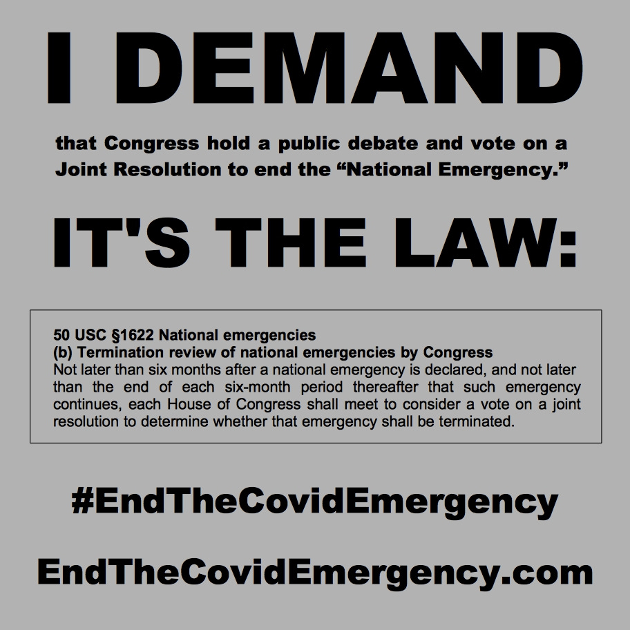 The United States of America is NOT a dictatorship. The COVID-19 National Emergency must be ended. Our Congressional representatives must listen to the will of the people, or else the purpose for which our nation was founded as a Representative Democracy will have ceased to exist.