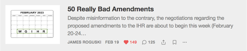 Can we go a step further and repeal the acts in 2005 in each nation that set up the original IHR framework. ALL PUBLIC HEALTH offices are satellites of the WHO. as such they are foreign bodies operating on our soils and their employees are beholden to another body. Most people do not appreciate this fact.