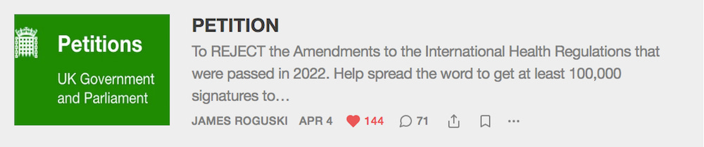 Join me on Twitter at 11am Pacific time on Tuesday 11 April 2023 to discuss the upcoming UK Parliamentary debate regarding the proposed "Pandemic Treaty" and UK Petition #635904 about the amendments.
