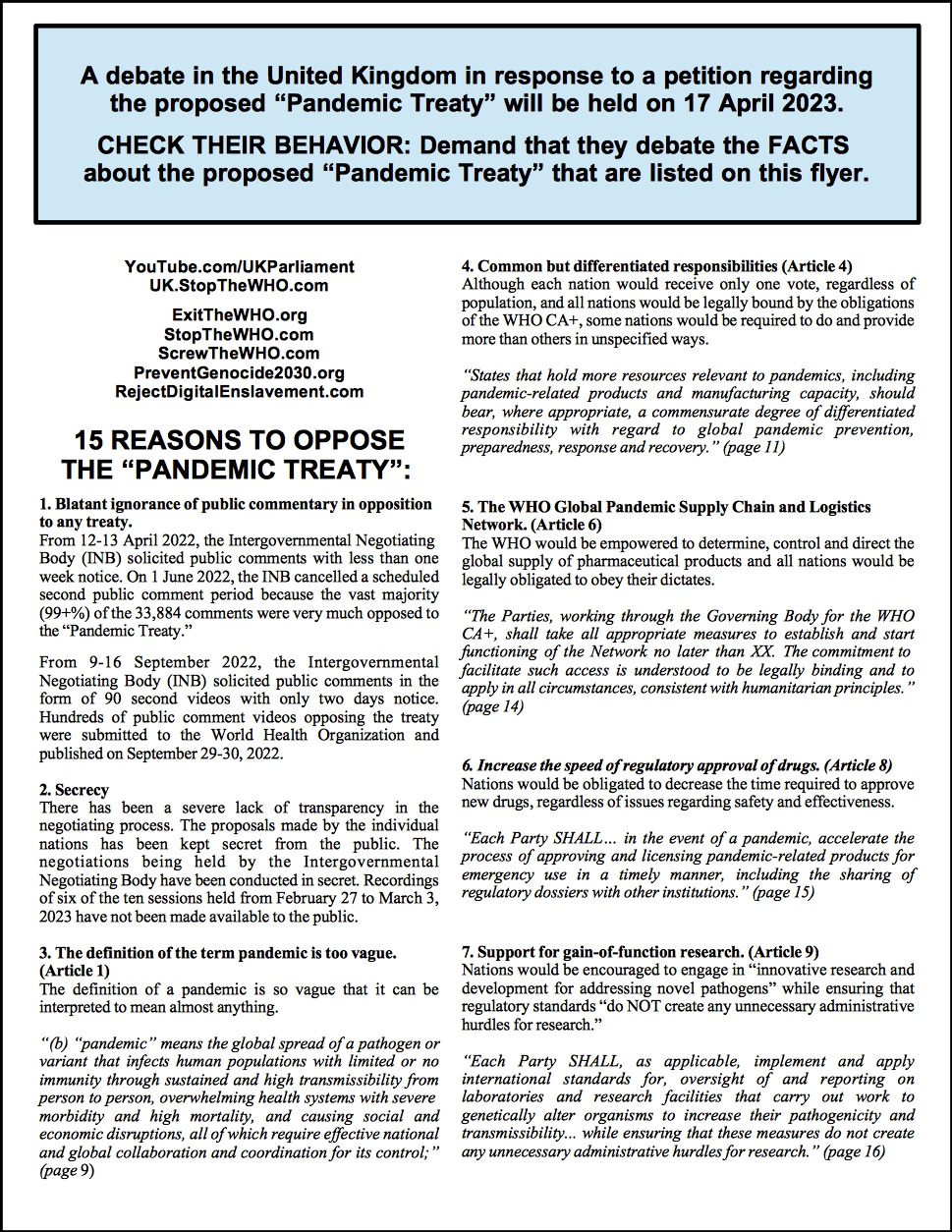 The upcoming debate with Members of Parliament at 4:30pm UK time on 17 April 2023 regarding the proposed “Pandemic Treaty” in Westminster Hall.